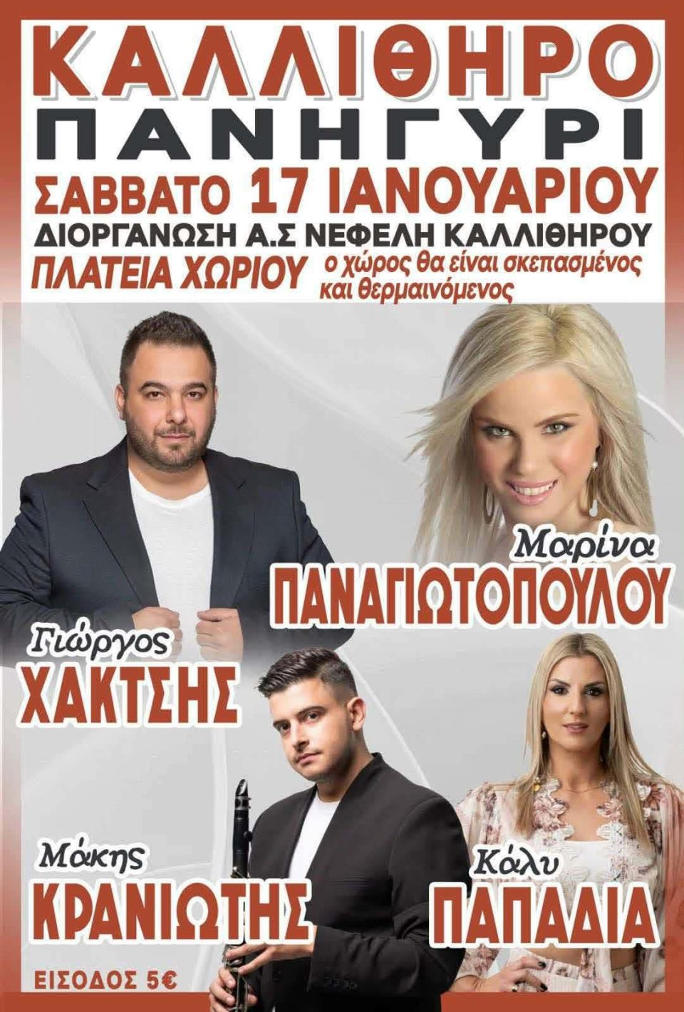 Το Σάββατο 17 Ιανουαρίου στην Κεντρική Πλατεία του Καλλιθήρου σε σκεπασμένο και θερμαινόμενο χώρο, θα απολαύσετε μία αξέχαστη λαϊκοδημοτική βραδιά με ένα πολύ πλούσιο καλλιτεχνικό πρόγραμμα.
