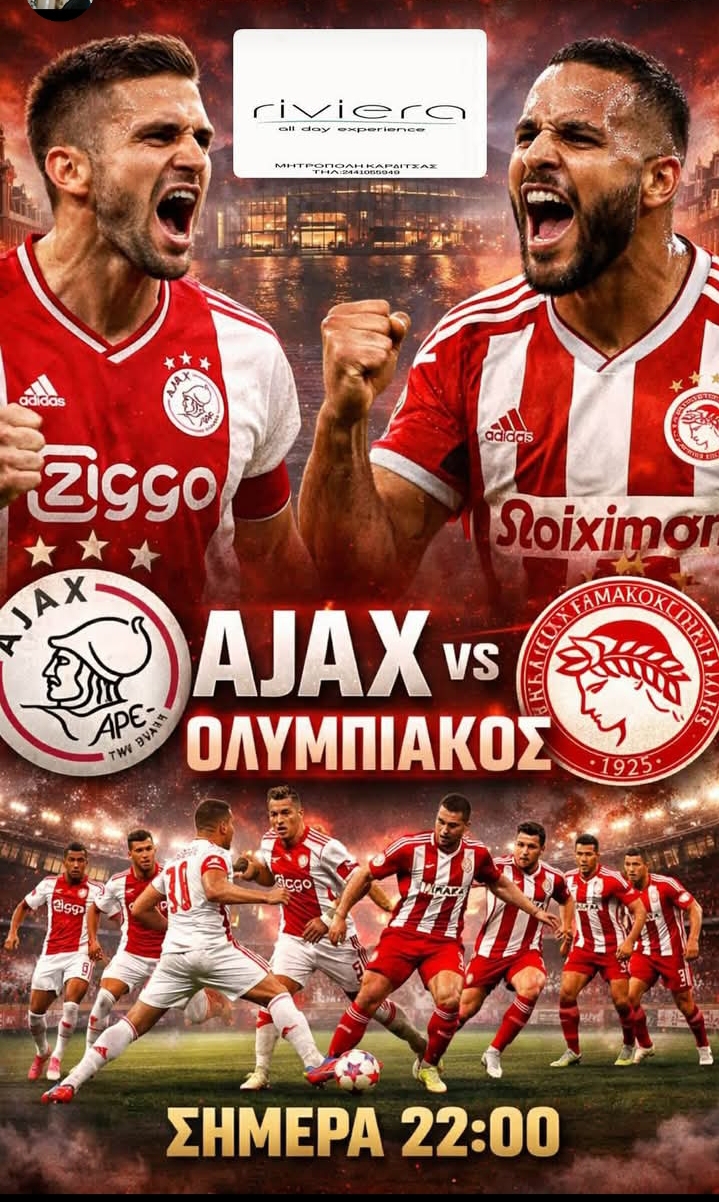 Στο κατάστημα Riviera all day του κ. Βαϊου Κωτούλα στην Μητρόπολη Καρδίτσας θα μπορέσετε να δείτε το κρίσιμο αγώνα του Ολυμπιακού στην Ολλανδία κόντρα στην ομάδα του Άγιαξ.