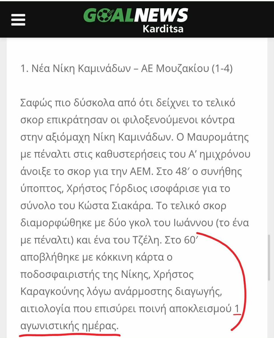 Όπως θα παρατηρήσετε και στη φωτογραφία που σας παραθέτουμε, την προηγούμενη εβδομάδα σας είχαμε ενημερώσει ότι ο ποδοσφαιριστής της Νέας Νίκης Καμινάδων, Χρήστος Καραγκούνης, λόγω αποβολής σε παιχνίδι της ομάδας του, θα τιμωρηθεί με αποκλεισμό 1 αγωνιστικής ημέρας.