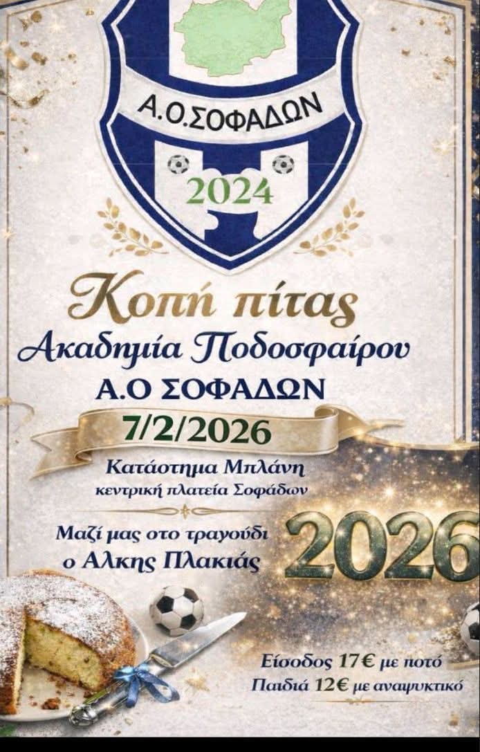 Στο κατάστημα Μπλάνης θα πραγματοποιηθεί η κοπή πίτας του ΑΟ Σοφάδων το Σάββατο 7/2/2026.