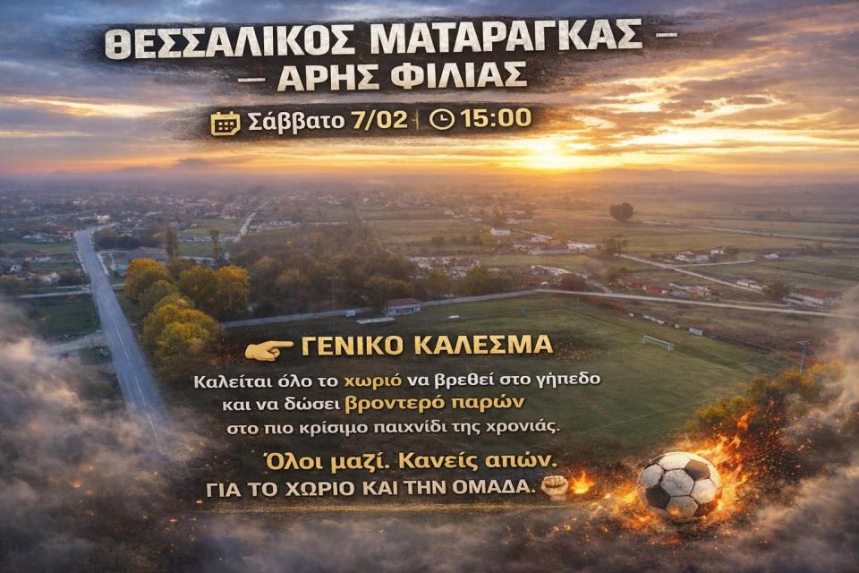 Το Σάββατο στις 15:00, στο γήπεδο της Ματαράγκας, ο Θεσσαλικός Ματαράγκας αντιμετωπίζει τον Άρη Φιλιάς στον πιο κρίσιμο αγώνα της χρονιάς! Όλο το χωριό πρέπει να σταθεί δίπλα στην ομάδα, γιατί η δύναμή μας είναι η ενότητα και η στήριξή μας. Αυτός ο αγώνας αφορά όλους μας!