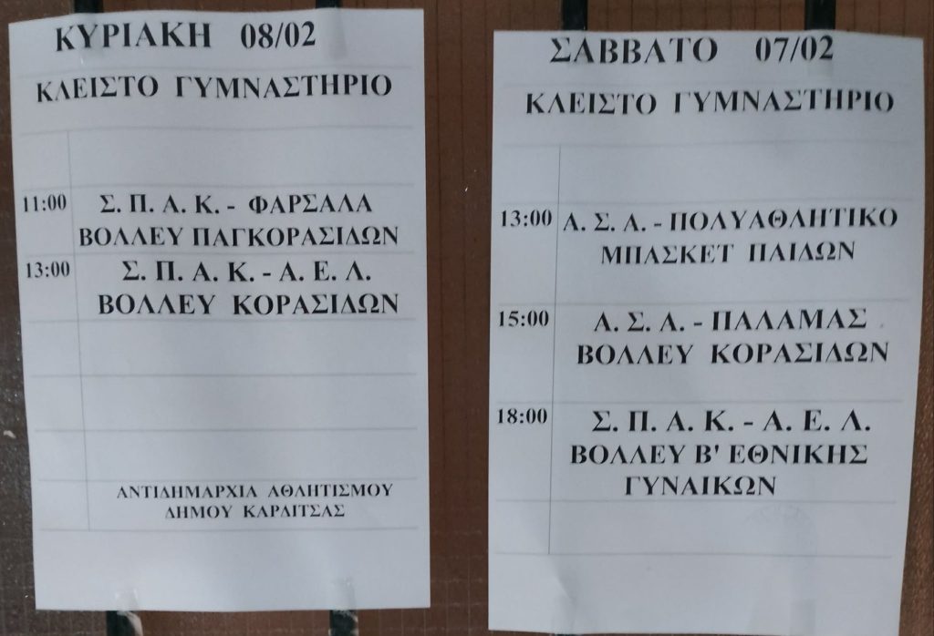 Το προσεχές Σαββατοκύριακο (7 & 8/2) στο παλαιό Κλειστό Γυμναστήριο της Καρδίτσας πρόκειται να διεξαχθούν οι ακόλουθοι αγώνες (δείτε στη φωτογραφία).