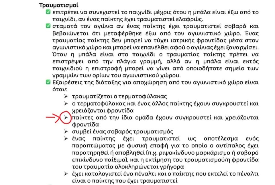 Βάσει της εξαίρεσης που προβλέπεται στους κανόνες του παιχνιδιού (δείτε τη σχετική φωτογραφία), οι Ρέτσος και Πιρόλα δεν έπρεπε να βγουν εκτός αγωνιστικού χώρου για την παροχή των πρώτων βοηθειών, καθώς μ’ αυτόν τον τρόπο οι ερυθρόλευκοι θα έμεναν με 9 ποδοσφαιριστές, με σημαντικό αριθμητικό μειονέκτημα.
