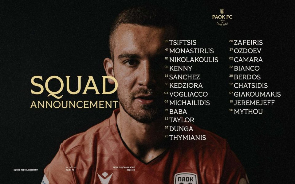 Η αποστολή του Δικεφάλου του Βορρά για το ματς της Πέμπτης (26/2 και ώρα 22:00) με τη Θέλτα στην Ισπανία.