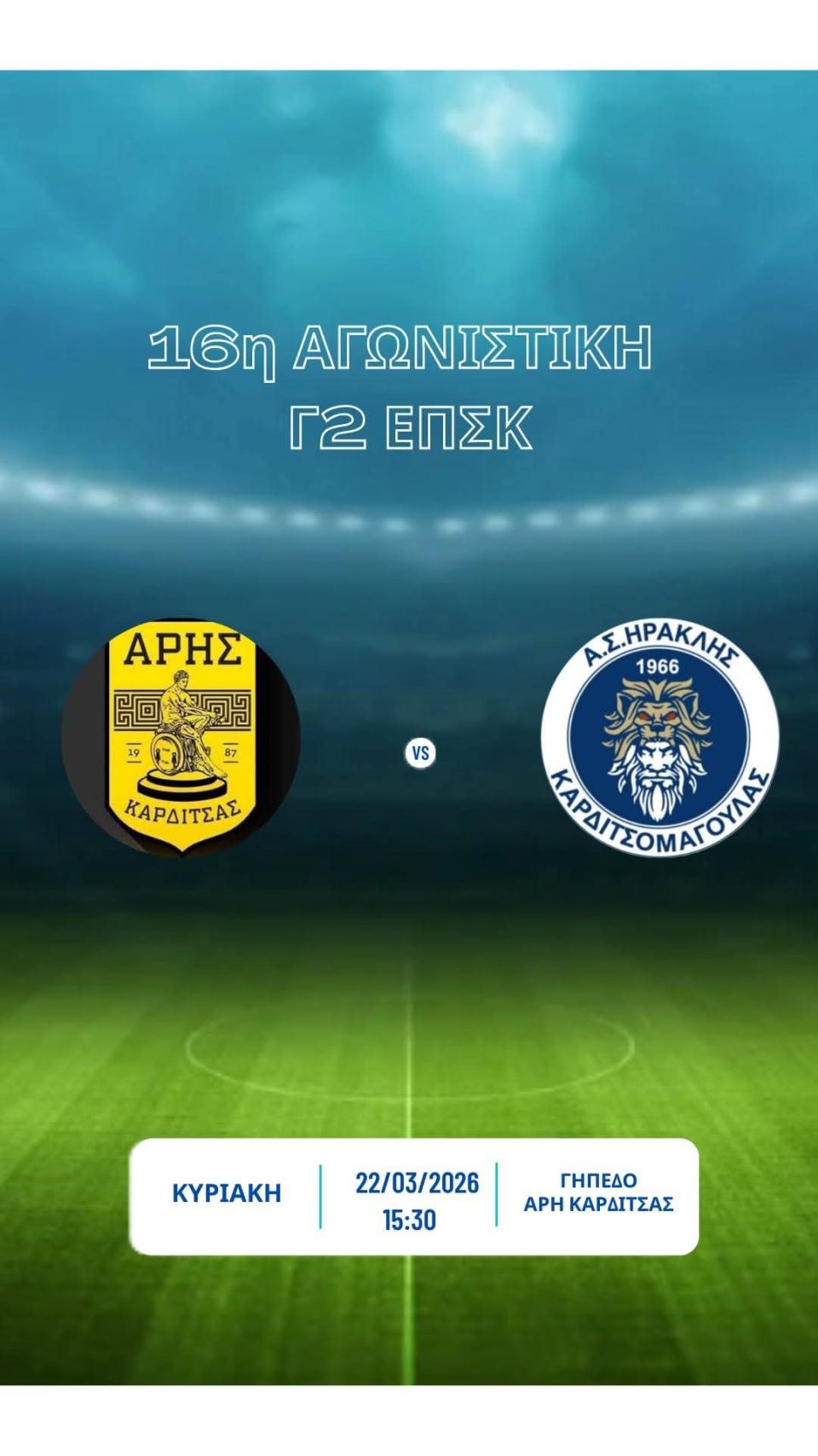 Για την 16η αγωνιστική του πρωταθλήματος της Γ2 ΕΠΣΚ,ο Ηρακλής μας θα αντιμετωπίσει,εκτός έδρας,στο γήπεδο της συνοικίας της Αγίας Παρασκευής,την νεανική ομάδα του Άρη Καρδίτσας Β’.